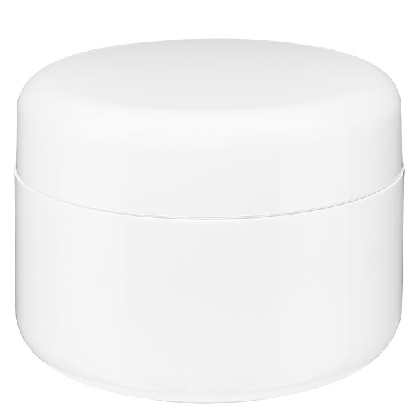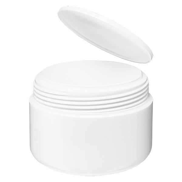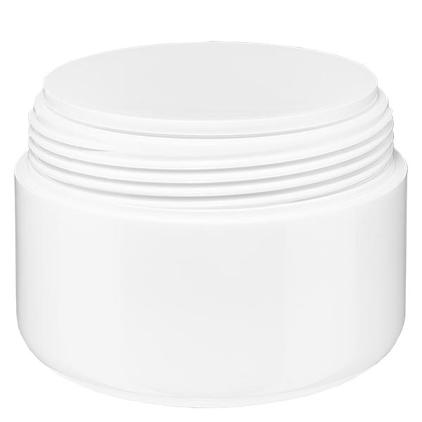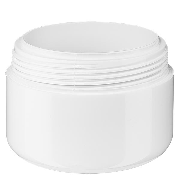 Bote de crema de 100 ml, color blanco, con tapa de rosca y obturador a medida. Forma clásica con bordes redondeados (Softline). El bote de crema de 100 ml es de doble pared y posee acabados de alta calidad. La base semirredonda por dentro garantiza una retirada sencilla del contenido.