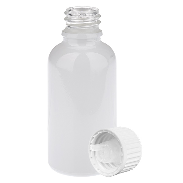 - Descripción del frasco de vidrio: Vidrio tipo III (DIN 719 o clase de recipiente III según DIN 52339-TO180). El vidrio transparente se recubre con un brillante acabado blanco en el exterior mediante un laborioso proceso. Esto garantiza una presentación de alta calidad del contenido. Se puede ver el nivel de llenado del vidrio. No obstante, el contenido está protegido de la luz solar directa.