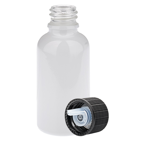 - Descripción del frasco de vidrio: Vidrio tipo III (DIN 719 o clase de recipiente III según DIN 52339-TO180). El vidrio transparente se recubre con un brillante acabado blanco en el exterior mediante un laborioso proceso. Esto garantiza una presentación de alta calidad del contenido. Se puede ver el nivel de llenado del vidrio. No obstante, el contenido está protegido de la luz solar directa.