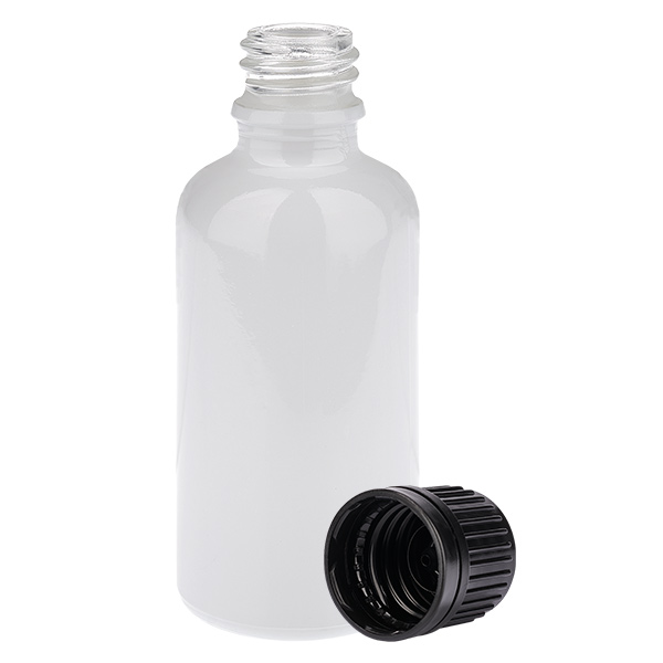- Descripción del frasco de vidrio: Vidrio tipo III (DIN 719 o clase de recipiente III según DIN 52339-TO180). El vidrio transparente se recubre con un brillante acabado blanco en el exterior mediante un laborioso proceso. Esto garantiza una presentación de alta calidad del contenido. Se puede ver el nivel de llenado del vidrio. No obstante, el contenido está protegido de la luz solar directa.