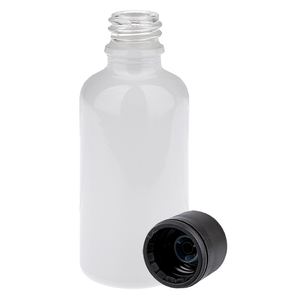 - Descripción del frasco de vidrio: Vidrio tipo III (DIN 719 o clase de recipiente III según DIN 52339-TO180). El vidrio transparente se recubre con un brillante acabado blanco en el exterior mediante un laborioso proceso. Esto garantiza una presentación de alta calidad del contenido. Se puede ver el nivel de llenado del vidrio. No obstante, el contenido está protegido de la luz solar directa.