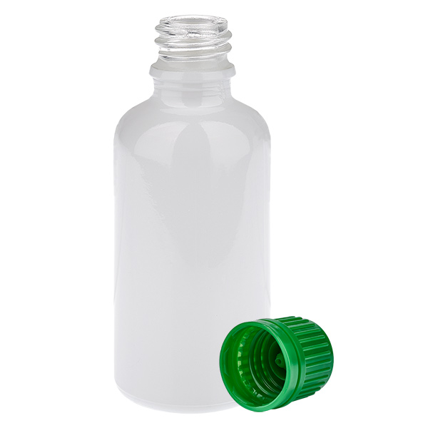 - Descripción del frasco de vidrio: Tipo de vidrio III (DIN 719 o clase de recipiente III según DIN 52339-TO180). El vidrio transparente se recubre con un brillante acabado blanco en el exterior mediante un laborioso proceso. Esto garantiza una presentación de alta calidad del contenido. Se puede ver el nivel de llenado del frasco. No obstante, el contenido está protegido de la luz solar directa.