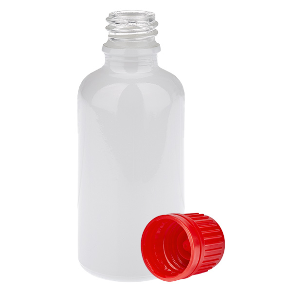 - Descripción del frasco de vidrio: Tipo de vidrio III (DIN 719 o clase de recipiente III según DIN 52339-TO180). El vidrio transparente se recubre con un brillante acabado blanco en el exterior mediante un laborioso proceso. Esto garantiza una presentación de alta calidad del contenido. Se puede ver el nivel de llenado del frasco. No obstante, el contenido está protegido de la luz solar directa.