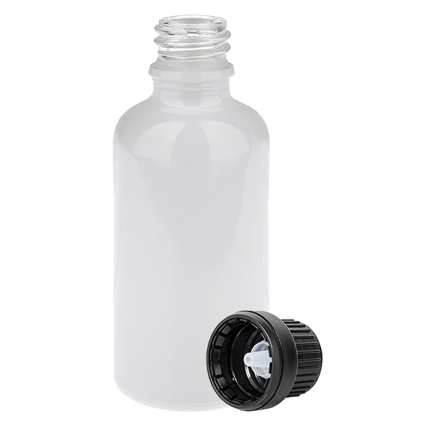 - Descripción del frasco de vidrio: Vidrio tipo III (DIN 719 o clase de recipiente III según DIN 52339-TO180). El vidrio transparente se recubre con un brillante acabado blanco en el exterior mediante un laborioso proceso. Esto garantiza una presentación de alta calidad del contenido. Se puede ver el nivel de llenado del frasco. No obstante, el contenido está protegido de la luz solar directa.