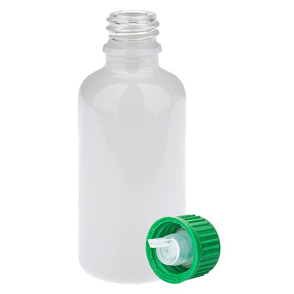 - Descripción del frasco de vidrio: tipo de vidrio III (DIN 719 o clase de recipiente III según DIN 52339-TO180). El vidrio transparente se recubre en el exterior con un brillante acabado blanco mediante un laborioso proceso. Esto garantiza una presentación de alta calidad del contenido. Se puede ver el nivel de llenado del vidrio. No obstante, el contenido está protegido de la luz solar directa.