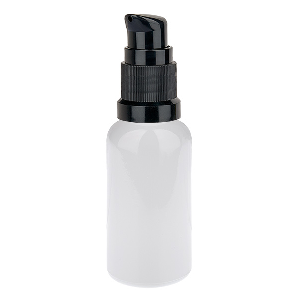 - Descripción del frasco de vidrio: Vidrio tipo III (DIN 719 o clase de recipiente III según DIN 52339-TO180). El vidrio transparente se recubre en el exterior con un brillante acabado blanco mediante un laborioso proceso. Esto garantiza una presentación de alta calidad del contenido. Se puede ver el nivel de llenado del vidrio. No obstante, el contenido está protegido de la luz solar directa.