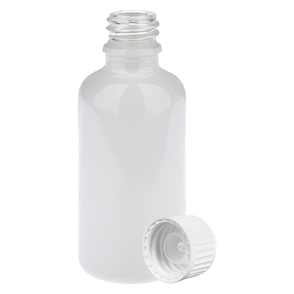- Descripción del frasco de vidrio: Vidrio tipo III (DIN 719 o clase de recipiente III según DIN 52339-TO180). El vidrio transparente se recubre con un brillante acabado blanco en el exterior mediante un laborioso proceso. Esto garantiza una presentación de alta calidad del contenido. Se puede ver el nivel de llenado del vidrio. No obstante, el contenido está protegido de la luz solar directa.