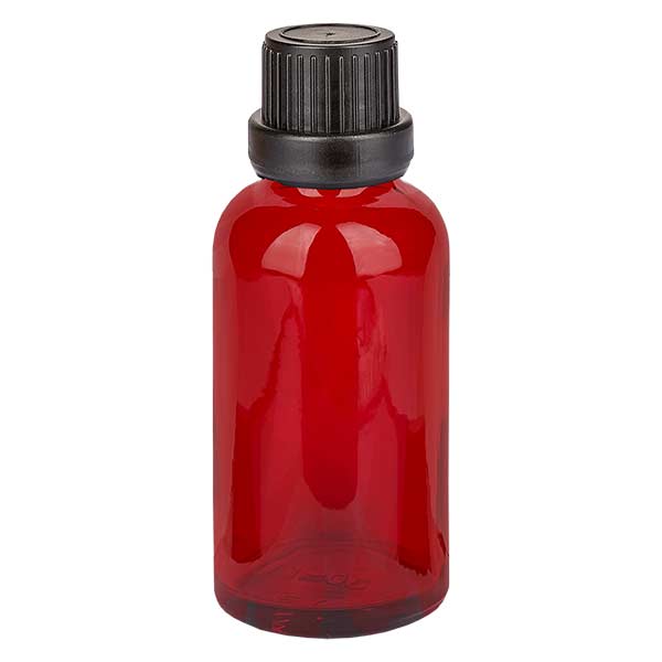 - Frasco de farmacia tipo de vidrio III (DIN 719 o envase de tipo III según DIN 52339-TO180). El vidrio transparente se dota de un revestimiento interior rojo en un laborioso proceso y es apto para uso alimentario y para productos farmacéuticos.