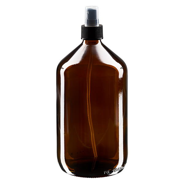 Frasco de medicina según norma europea de 1000 ml, ámbar, con atomizador negro y capuchón transparente