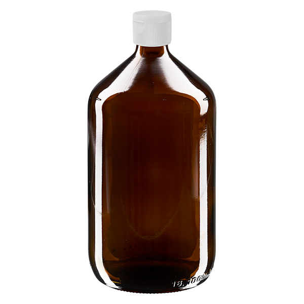 Frasco de medicina según norma europea de 1000 ml, ámbar, con tapón bisagra blanco
