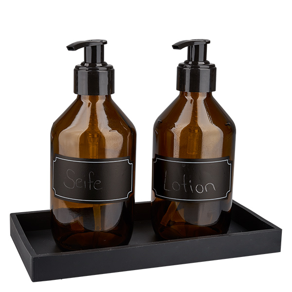 Dispensador de jabón (250ml): Fabricado en cristal ámbar de alta calidad, este dispensador aporta a su baño una estética moderna y atemporal. El tapón de plástico de la bomba garantiza una dispensación fiable y fácil, mientras que el cristal ámbar no sólo es visualmente atractivo, sino también especialmente resistente.