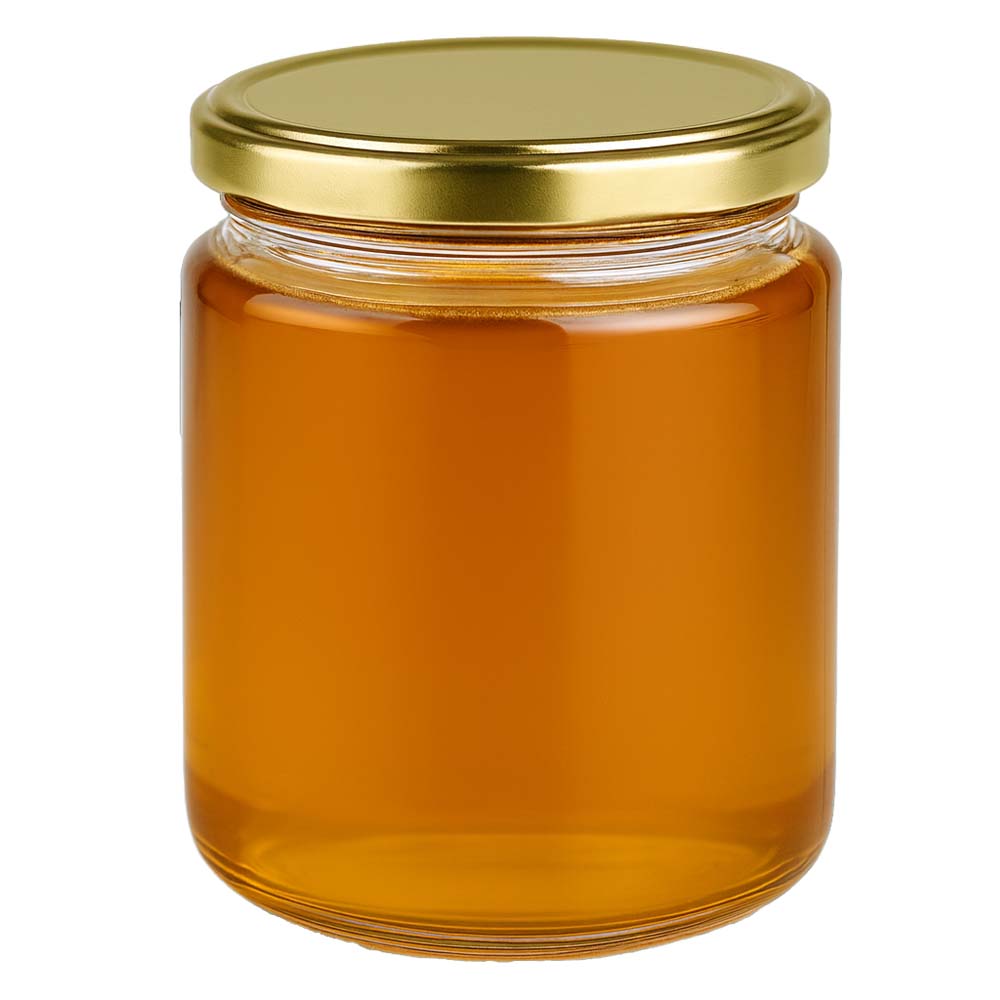 Tarro de vidrio para miel de 350 g con tapa metálica dorada BasicSeal UNiTWIST. Ideal para ventas premium, presentaciones atractivas y packs regalo.